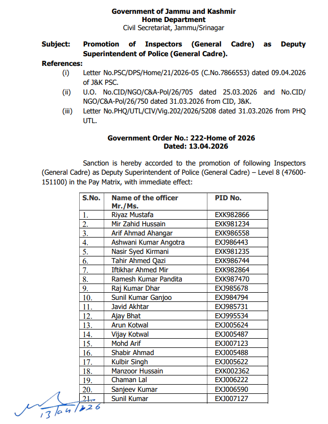 JAMMU, Apr 13: The Jammu and Kashmir Government has ordered the promotion of 24 Inspectors of the General Cadre as Deputy Superintendents of Police (DySPs) with immediate effect.