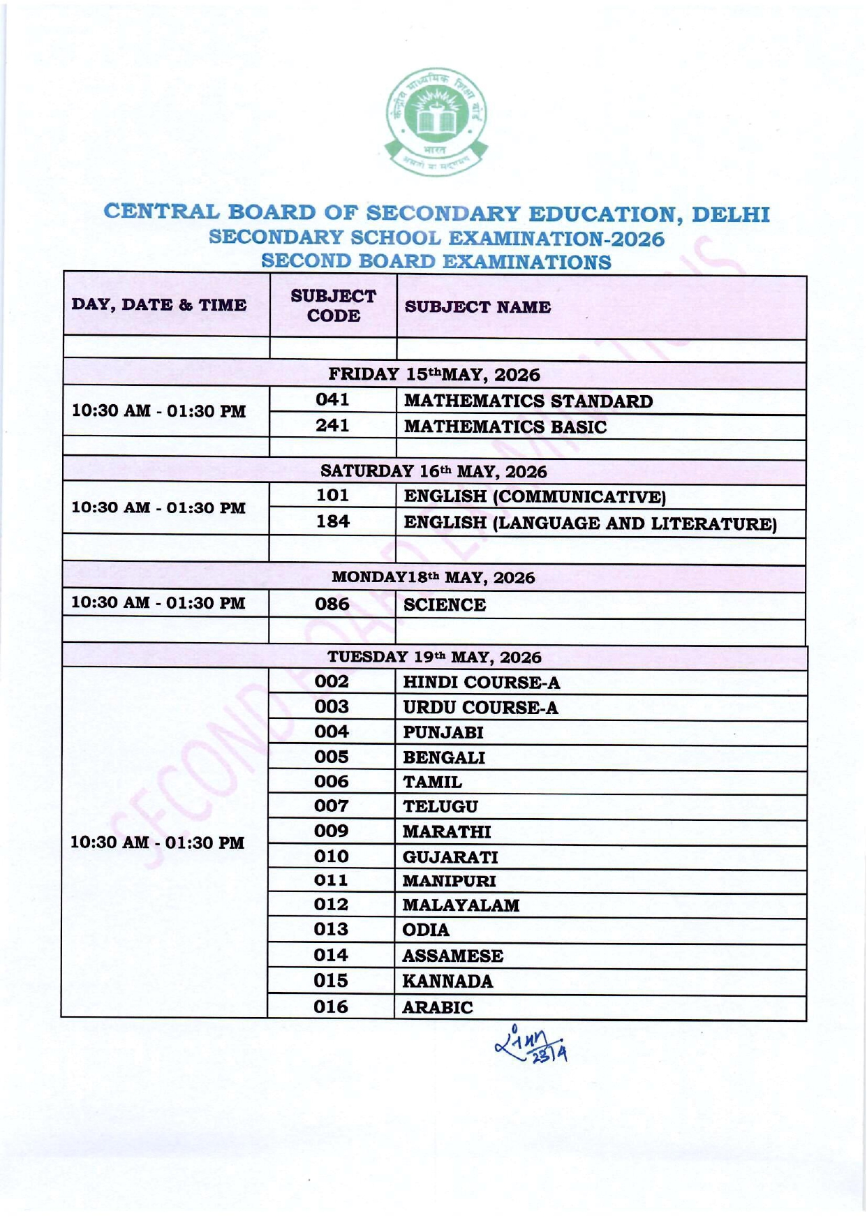 NEW DELHI, Apr 23: The CBSE on Thursday announced the schedule for the second board examinations for Class-10, to be held from May 15 to May 21.