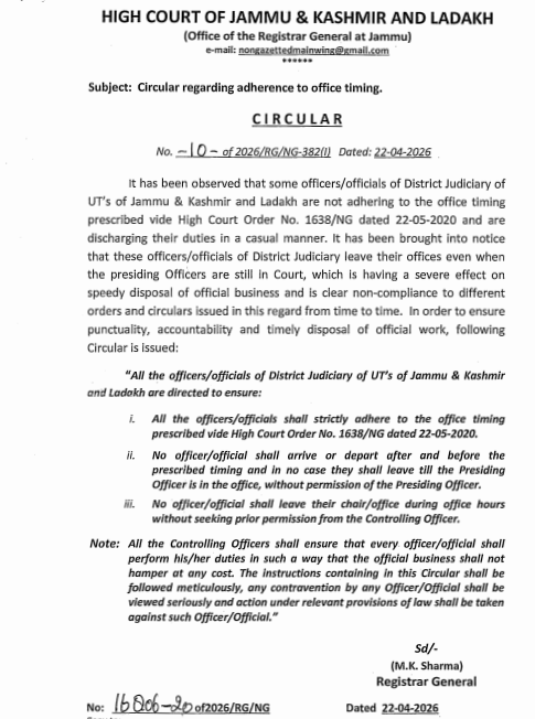 The High Court of Jammu and Kashmir and Ladakh has issued a circular directing all officers and officials of the District Judiciary to strictly follow prescribed office timings and maintain discipline at the workplace.